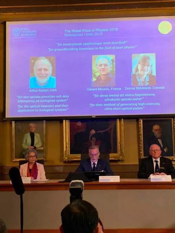 北京时间10月2日17时50分许,瑞典皇家科学院在斯德哥尔摩宣布,将2018年诺贝尔物理学奖授予美国科学家Arthur Ashkin和法国科学家 Gérard Mourou、加拿大科学家Donna Strickland,以表彰他们“在激光物理领域的突破性发明”。