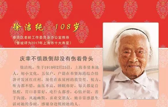 108岁的徐洁纯老人是上海奉贤本地人,现居住在农展村的教堂里。她的视力、 听力都不错,血压不高,睡眠亦好,每天都是自然醒,胃口非常好,吃什么都香,心情开朗,善于沟通,风趣幽默,喜欢交朋友。她非常感恩生活对她的眷顾,感谢身边照顾她的人。