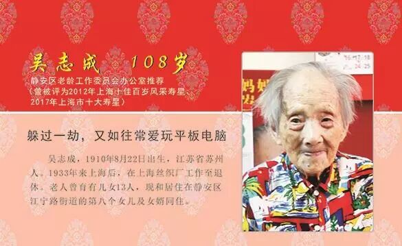 徐素珍,111岁;苏阿银,110岁;季林郎,109岁;何莲芳,108岁;徐洁纯,108岁;俞丽芬,108岁;吴志成,108岁;沈承玉,108岁;沈志容,108岁;沈巧碗,107岁。