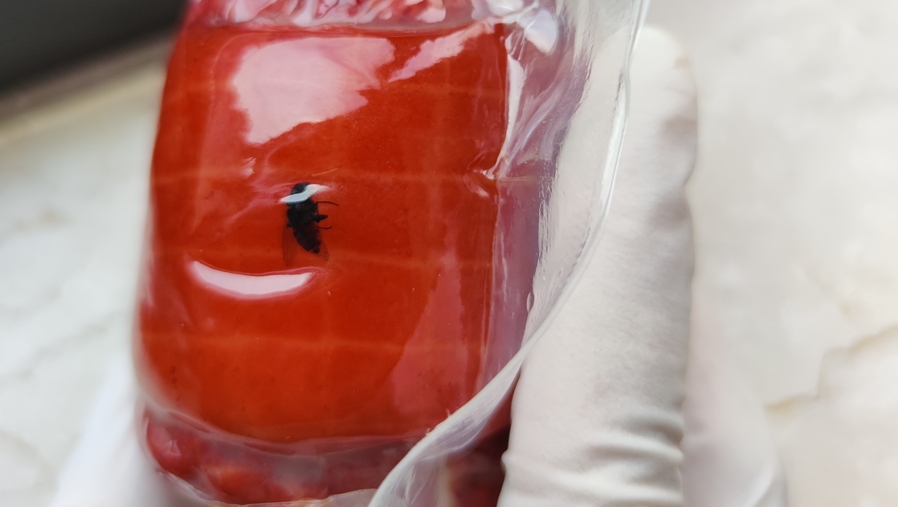 有居民收到物资后,反映一包真空包装酱香肘的袋内有一只苍蝇。