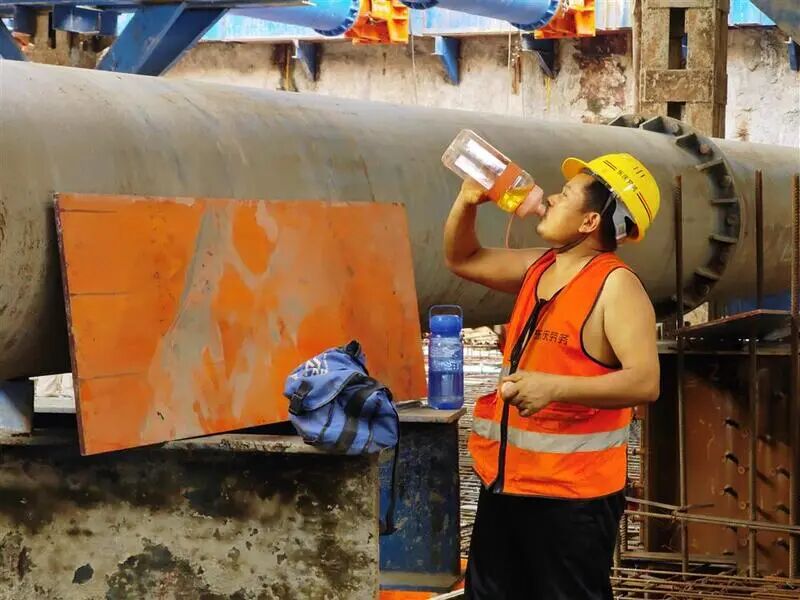 为了应对高温,鲁师傅所在的工地为每人每天配了两瓶盐汽水。此外,180名工人几乎人手一个一升装的水壶,他们每人每天要喝掉两三壶的水。