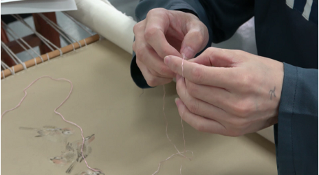 作为青浦监狱的共建单位,松江区文化馆带着民间书法、国画、顾绣、皮影等近60件作品在监狱大墙内展出。当时还在服刑期的徐某就被一幅作品吸引,不禁感慨:“画得真好。”一旁的民警听到后告诉他,“这不是画,是绣出来的,顾绣。”徐某诧异不已。顾绣的基本功就是以针代笔,以线代墨,在绣面上作画。本身就有绘画功底的徐某,随即向民警申请参加顾绣习艺。学顾绣,入门之初,仅“劈丝”这一道工序就要花费大量的时间去练习,一根线要分成2根丝,2分4……劈1至8丝时,大部分人都能顺利完成,然而再往下就愈发困难。