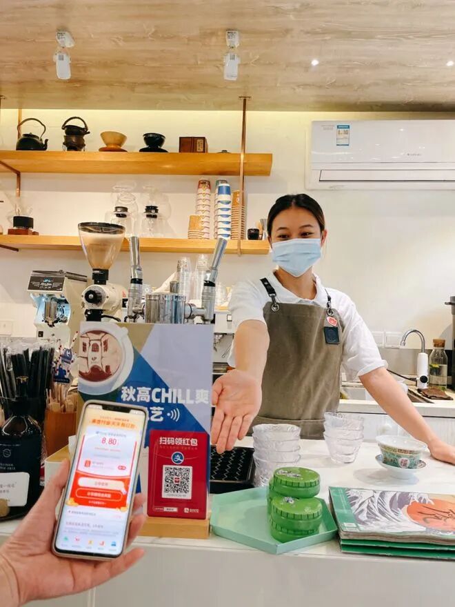 除了衡复文旅消费券,街区部分咖啡商户内,比如武康路上开了17年的马里昂巴、永康路上引领一时风尚的茶是一枝花、武康庭附近去年才开业的幸福咖啡店、主打电影文化的FILM电影时光咖啡书店……还能叠加支付宝的红包,左减减右减减,覅忒格算!