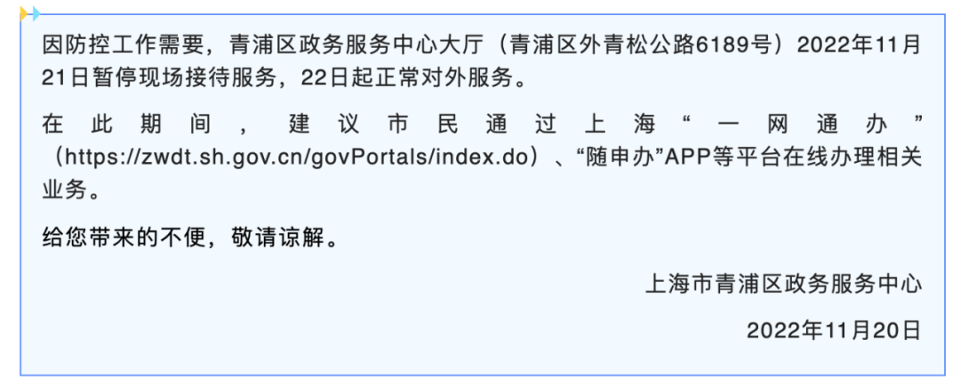 “绿色青浦”微信公众号11月20日发布通知称,因防控工作需要,青浦区政务服务中心大厅2022年11月21日(今天)暂停现场接待服务,22日(明天)起正常对外服务。