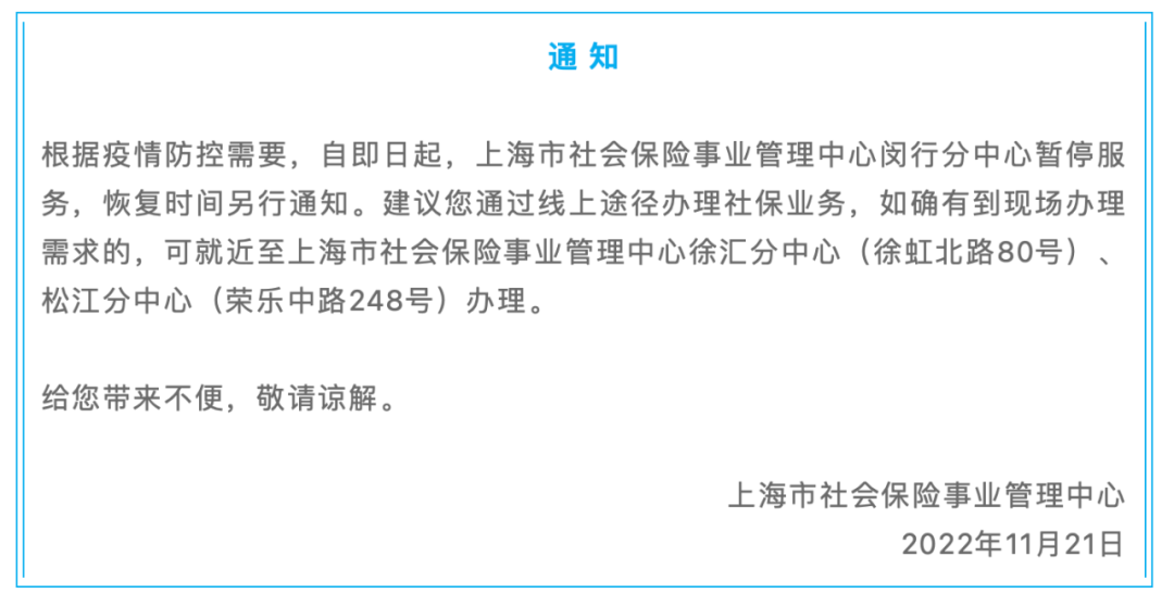 上海市社会保险事业管理中心发布消息:根据疫情防控需要,自即日起,上海市社会保险事业管理中心闵行分中心暂停服务,恢复时间另行通知。