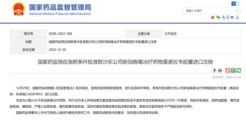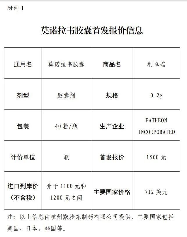 继辉瑞Paxlovid、河南真实生物阿兹夫定之后,第三款在国内获批的新冠口服药默沙东莫诺拉韦胶囊(Molnupiravir)中国报价出炉。1月10日,天津市医药采购中心公布新冠治疗药品莫诺拉韦胶囊首发报价公示,莫诺拉韦胶囊的首发报价为1500元/瓶,40粒/瓶,该药物主要国家的价格为712美元。1月10日,天津市医药采购中心发布《新冠治疗药品莫诺拉韦胶囊首发报价公示》,公示显示,莫诺拉韦胶囊首发报价1500元/瓶,40粒/瓶,进口到岸价(不含税)介于1100元和1200元之间,主要国家价格712美元(约合4826元人民币),公示时间为2023年1月10日至1月16日。公告称,近日,国家医疗保障局办公室印发《新冠治疗药品价格形成指引(试行)》,2023年1月1日起批准上市的抗新冠病毒的创新治疗药品采取首发报价集中受理。杭州默沙东制药有限公司主动参照有关要求,就此前附条件批准上市的莫诺拉韦胶囊提交了首发报价和有关资料。去年12月29日,国家药监局根据《药品管理法》相关规定,按照药品特别审批程序,进行应急审评审批,附条件批准默沙东公司新冠病毒治疗药物莫诺拉韦胶囊(商品名称:利卓瑞/LAGEVRIO)进口注册。据药监局官网介绍:本品为口服小分子新冠病毒治疗药物,用于治疗成人伴有进展为重症高风险因素的轻至中度新型冠状病毒感染(COVID-19)患者,例如伴有高龄、肥胖或超重、慢性肾脏疾病、糖尿病、严重心血管疾病、慢性阻塞性肺疾病、活动性癌症等重症高风险因素的患者。患者应在医师指导下严格按说明书用药。国家药监局要求上市许可持有人继续开展相关研究工作,限期完成附条件的要求,及时提交后续研究结果。初步看,莫诺拉韦胶囊每瓶的报价低于辉瑞新冠口服药Paxlovid的价格,后者在中国一些地方的临时医保支付价1890元/盒。去年9月,默沙东与国药集团签署合作框架协议,将莫诺拉韦在中国境内的经销权和独家进口权授予国药集团。去年11月,默沙东与国药控股分销中心有限公司就莫诺拉韦在中国的进口和经销事宜签署经销协议。据澎湃新闻报道,国药控股副总裁蔡买松1月10日在接受采访时表示,“乐观估计,默沙东的新冠口服药莫诺拉韦有望于春节前在国内市面上进行销售。”“目前主要是手续,操作层面的问题都可以克服。”对于莫诺拉韦进入国内销售的最新进展,蔡买松向记者介绍,1月4日凌晨,首批新冠口服药莫诺拉韦已到达上海外高桥保税区仓库。“数量在几十万盒,现在每天都在陆续到货,后续也会持续进货。”去年12月29日,国家药监局根据《药品管理法》相关规定,按照药品特别审批程序,进行应急审评审批,附条件批准默沙东公司新冠病毒治疗药物莫诺拉韦胶囊(商品名称:利卓瑞/LAGEVRIO)进口注册。1月6日,国家卫健委发布《新型冠状病毒感染诊疗方案(试行第十版)》(以下简称“第十版”)。相比去年3月发布的《新型冠状病毒肺炎诊疗方案(试行第九版方案)》,抗病毒治疗内容中除了奈玛特韦片/利托那韦片组合包装(简称“Paxlovid”)、单克隆抗体、静注COVID-19人免疫球蛋白和康复者恢复期血浆外,最新方案新增了莫诺拉韦胶囊。从新冠药物的产品使用上来看,据第十版方案介绍,莫诺拉韦胶囊适用人群为发病5天以内的轻、中型且伴有进展为重症高风险因素的成年患者。用法为800毫克,每12小时口服1次,连续服用5天。不建议在妊娠期和哺乳期使用。据第一财经报道,默沙东莫诺拉韦胶囊与辉瑞Paxlovid获批的适应证类似,皆是用在有进展为重症高风险因素新冠成人患者上,具体莫诺拉韦胶囊用于治疗成人伴有进展为重症高风险因素的轻至中度新型冠状病毒感染(COVID-19)患者,例如伴有高龄、肥胖或超重、慢性肾脏疾病、糖尿病、严重心血管疾病、慢性阻塞性肺疾病、活动性癌症等重症高风险因素的患者。不过,默沙东莫诺拉韦胶囊与辉瑞Paxlovid选择开发的靶点不一样,前者属于RNA聚合酶(RdRp)抑制剂,通过阻断新冠病毒RNA依赖的RNA聚合酶的合成,达到抑制或清除病毒的作用;后者属于3CL蛋白酶抑制剂,通过阻断新冠病毒3CL蛋白酶的活性,从而破坏病毒RNA的复制过程。数据显示,在出现症状后3天或5天内服用Paxlovid可降低新冠相关住院或死亡风险高达89%和88%,莫诺拉韦可降低30%~50%的住院/死亡风险,可降低89%~100%的死亡风险。辉瑞CEO:将在中国生产Paxlovid
