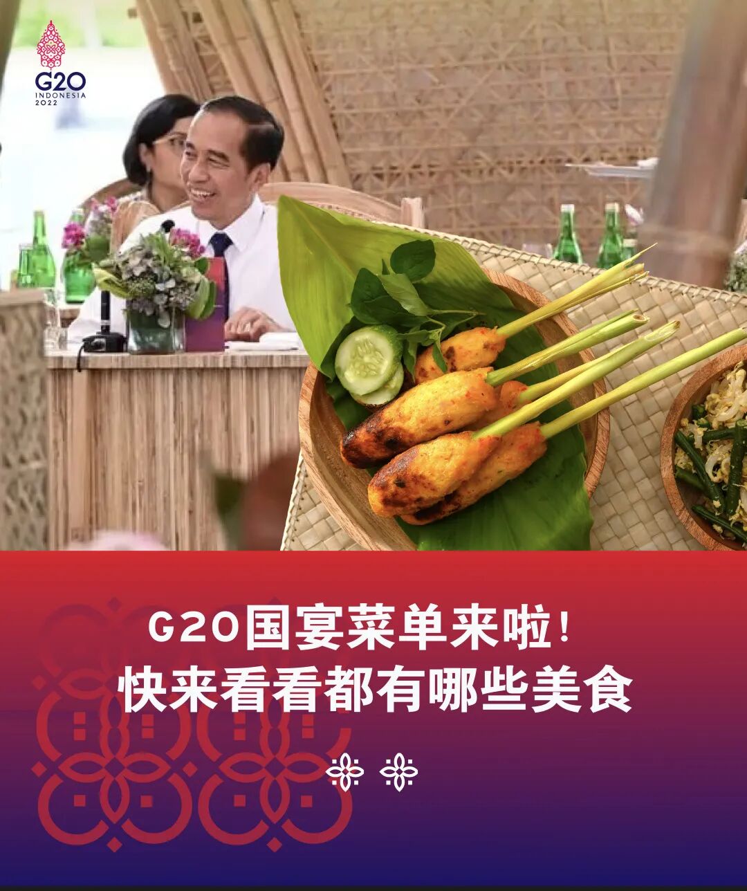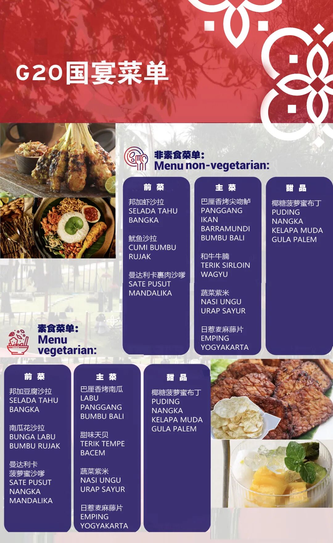 作为美食大国,印尼会在G20宴会上为贵宾们准备哪些菜肴呢?毫无疑问,所有餐食均为印尼传统特色菜啦,分为非素食菜单和素食菜单两大类。