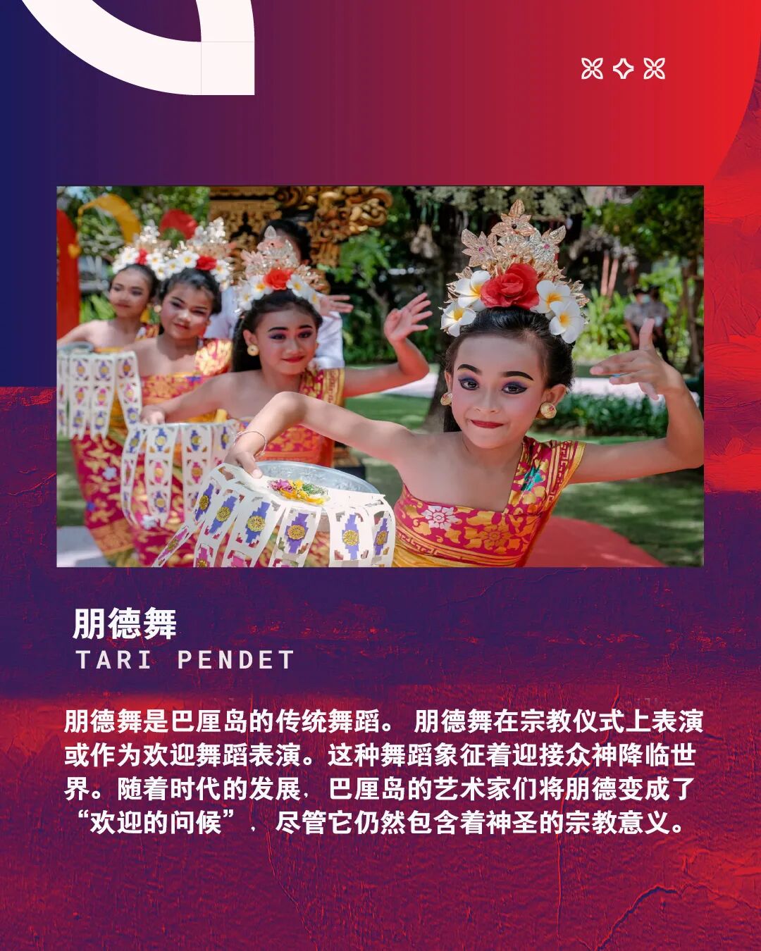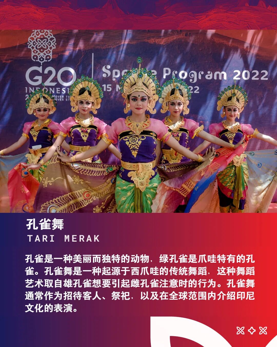 在G20峰会期间,印尼也用各种形式的舞蹈向贵宾们表达了诚挚的情谊:作为欢迎仪式的朋德舞 (Pendet);源自印度教古老传说,在日落时乌鲁瓦图悬崖上演的卡恰舞(Kecak);表现“希望和祈祷”的托特舞(Tor-tor)、隆重优雅的孔雀舞(Merak)等等。