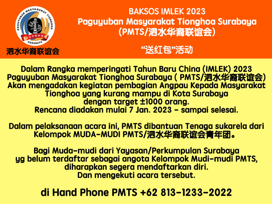 HARI RAYA IM LEK 2023 semakin dekat. Di bawah koordinasi Paguyuban Masyarakat Persahabatan Tionghoa Surabaya/PMTS telah merencanakan kegiatan "Pembagian Angpao untuk membantu masyarakat Tionghoa yang kurang mampu", yang mana “Perkumpulan Tionghoa Surabaya” juga turut berpartisipasi di dalamnya.