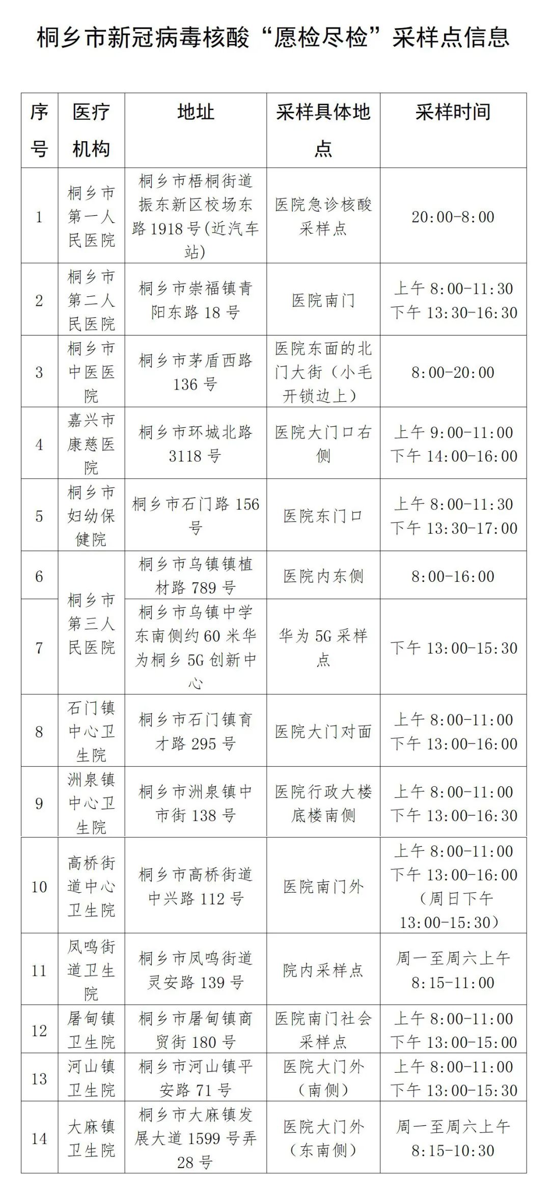 附:桐乡市新冠病毒核酸“愿检尽检”采样点信息