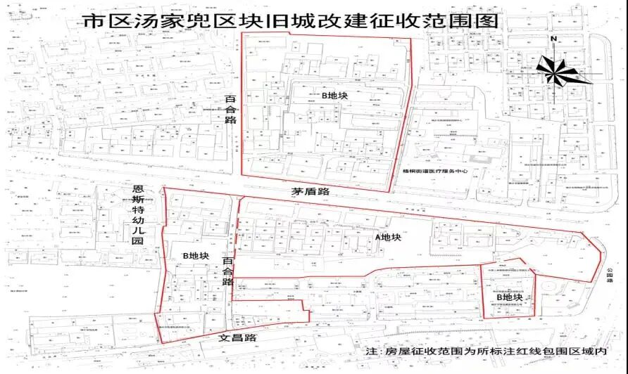 市区汤家兜区块旧城改建项目征收范围以茅盾路为界,分南北两个区域,南区块为恩斯特幼儿园以东,茅盾路以南,公园路以西,文昌路以北(中国人寿保险和文昌苑除外);北区块为百合路以东,梧桐街道社区卫生服务中心以西,茅盾路以北。该区域总占地面积85.2亩,涉及被征收户171户,总建筑面积4.6万平方米。