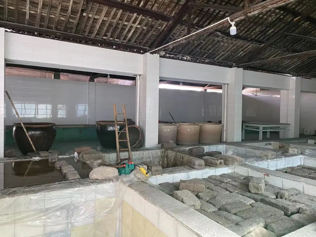 高介湾酱菜厂如今这7间车间建于1994年,不大的腌制车间,排列着20口腌制池,四五平米大小,三四米深,工人需要借助梯子才能下到底部。压酱菜的条石码放得整整齐齐,榨菜、什锦菜、腌黄瓜、醋蒜头等酱菜静静“躺”在腌制池里,这也是酱菜厂目前主要在经营的酱菜品类。