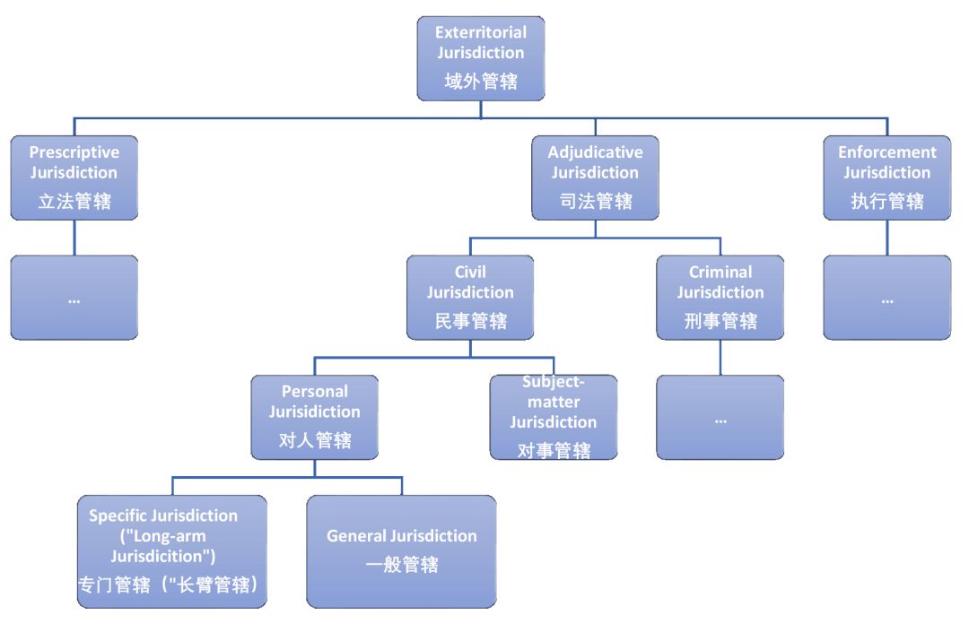 管辖权是指影响法律利益的权力。因此,域外管辖是指行政、立法、司法等政府机关在政府辖区以外影响法律利益的权力。美国同时实行联邦制和三权分立制,联邦层面和州层面的立法、行政和司法机关都享有部分法律权力,因此美国域外管辖的表现形式多种多样。但是,本文将重点关注美国联邦法院如何对非美国居民行使管辖权。