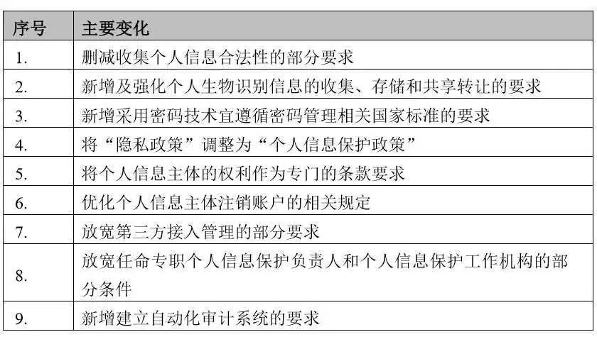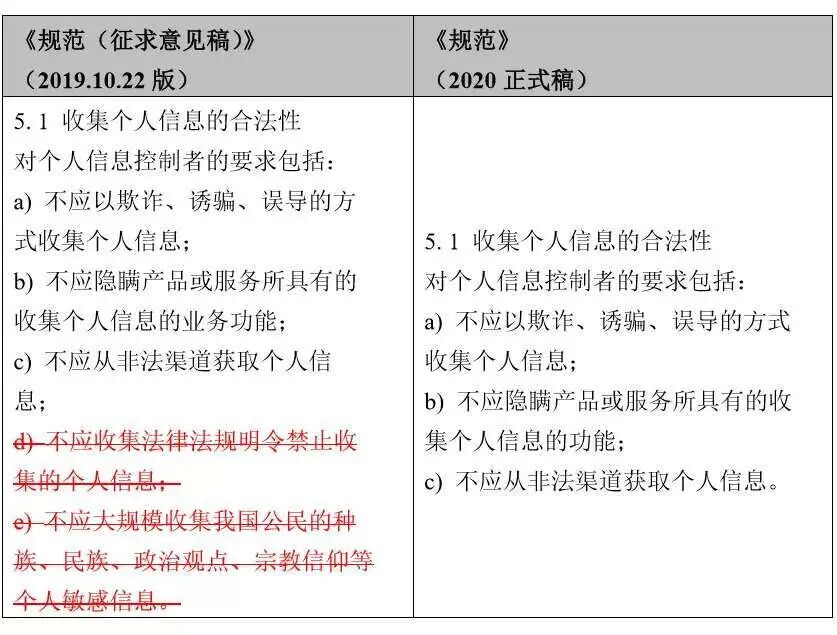 根据条文对比,可以看出,对于收集个人信息的合法性要求,《规范》(2020正式稿)删除了原有的“不应收集法律法规明令禁止收集的个人信息”和“不应大规模收集我国公民的种族、民族、政治观点、宗教信仰等个人敏感信息”的要求。