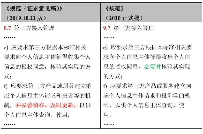 《规范》(2020正式稿)放宽了第三方接入管理中对于核验第三方征得个人信息主体同意的方式的要求,删去了“妥善留存、及时更新第三方产品或服务建立响应个人信息主体请求和投诉等的机制”的要求。