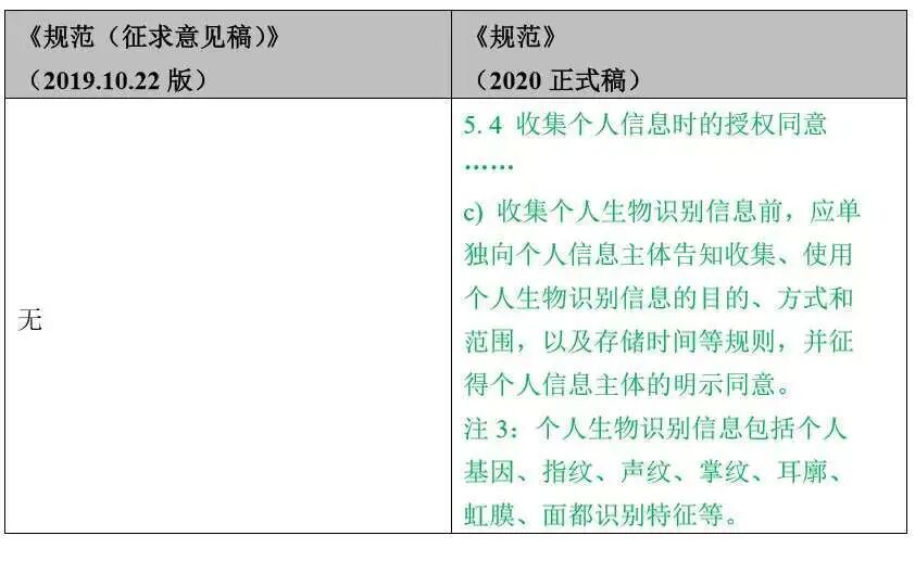 《规范》(2020正式稿)新增了对收集个人生物识别信息的要求。