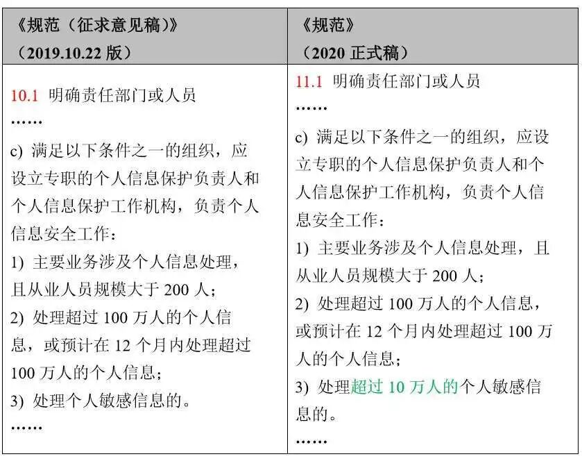 《规范》(2020正式稿)将处理个人敏感信息即需要设立专职的个人信息保护负责人和个人信息保护工作机构,放宽至处理超过10万人的个人敏感信息。实践中,并非多数企业都能触发列举的前两个从业人员规模、处理个人信息数量要求,但一般来说,涉及收集使用个人信息的企业,大多数都会涉及到处理个人敏感信息。如果按照处理个人敏感信息即需要设立专职的要求,可以说,多数企业均需要设置个人信息保护专职负责人和工作机构。而放宽至处理超过10万人的个人敏感信息,能够将一部分企业筛除在外,提高了该等要求的可执行性和科学性。