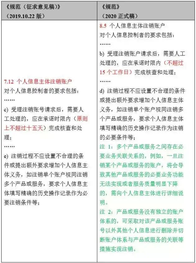 《规范》(2020正式稿)放宽了人工处理注销账号的时间要求,提高了“不应注销单个账户视同注销多个产品或服务”的可执行性。