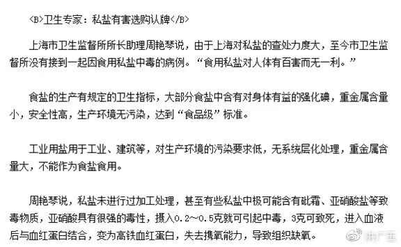 2、“私盐”“工业盐”只是不合法,一般情况下均没有健康危害;