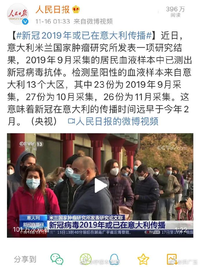 去年11月,媒体广泛报道意大利北部地区一些血液样品中检出抗体阳性的问题,由于这项当时是由米兰癌症研究所和意大利锡耶纳大学合作完成的,看起来有一定可信度,所以也被中国网友广泛引用,被认为是重要“证据”。