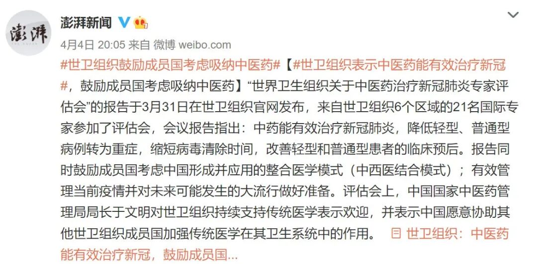 最近一周来,网络上出现了一波“世卫组织表示中医药能有效治疗新冠肺炎”的报道。比如,最典型的是澎湃新闻的报道,用了两个话题标签: