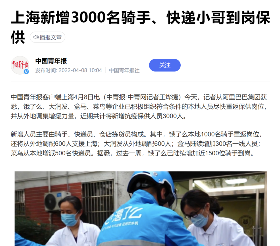 真实情况是,现在的上海相当于“战时”,居高的物价背后,是运营成本也大涨了。比如大家可以看到,从外地调到上海去的三五千名“骑手”,他们到了上海以后,为了减少传播风险,除了常规的防疫措施,平台还要专门要安排酒店和住宿点。