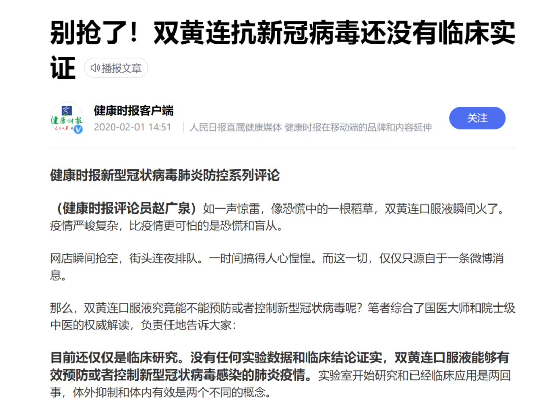 因为民愤太大,搞得主流媒体只能出来圆场:别抢了,双黄连还没有临床实证!