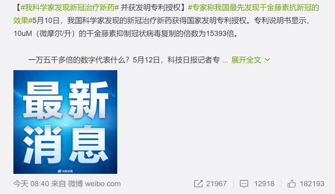 | 这个所谓的“抗新冠新药”,其实跟“双黄连口服液”一样只做了体外实验。