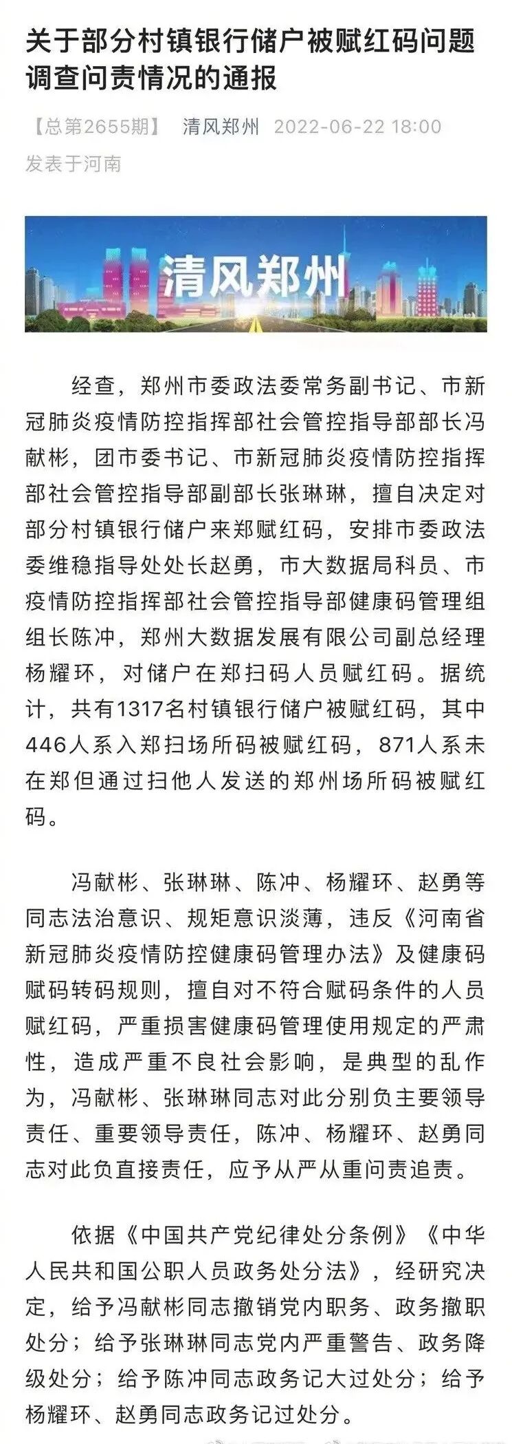 昨日,郑州市纪委就部分村镇银行储户被赋红码问题发布通报,对涉事的多位干部和工作人员进行了处分,比如郑州市委政法委常务副书记冯献彬撤销党内职务、政务撤职处分,其他人也分别被处以严重警告或降级、记过等处分。