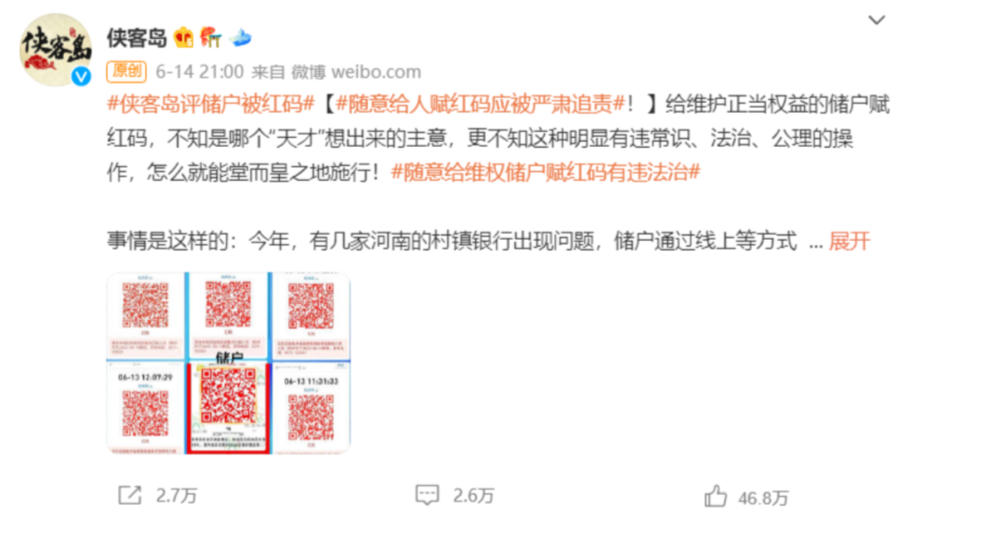 另外,本人认为,一个地方政法委负责人为何会利用红码去阻挠“村镇银行”的储户维权,是否受人请托、涉及钱权交易,也值得认真查一查。