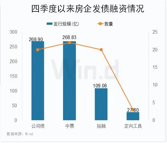 四季度以来从房企国内发债具体融资来看,Wind数据显示,地产企业合计发行了65只债券,涉及43家公司,总融资规模为674.61亿。
