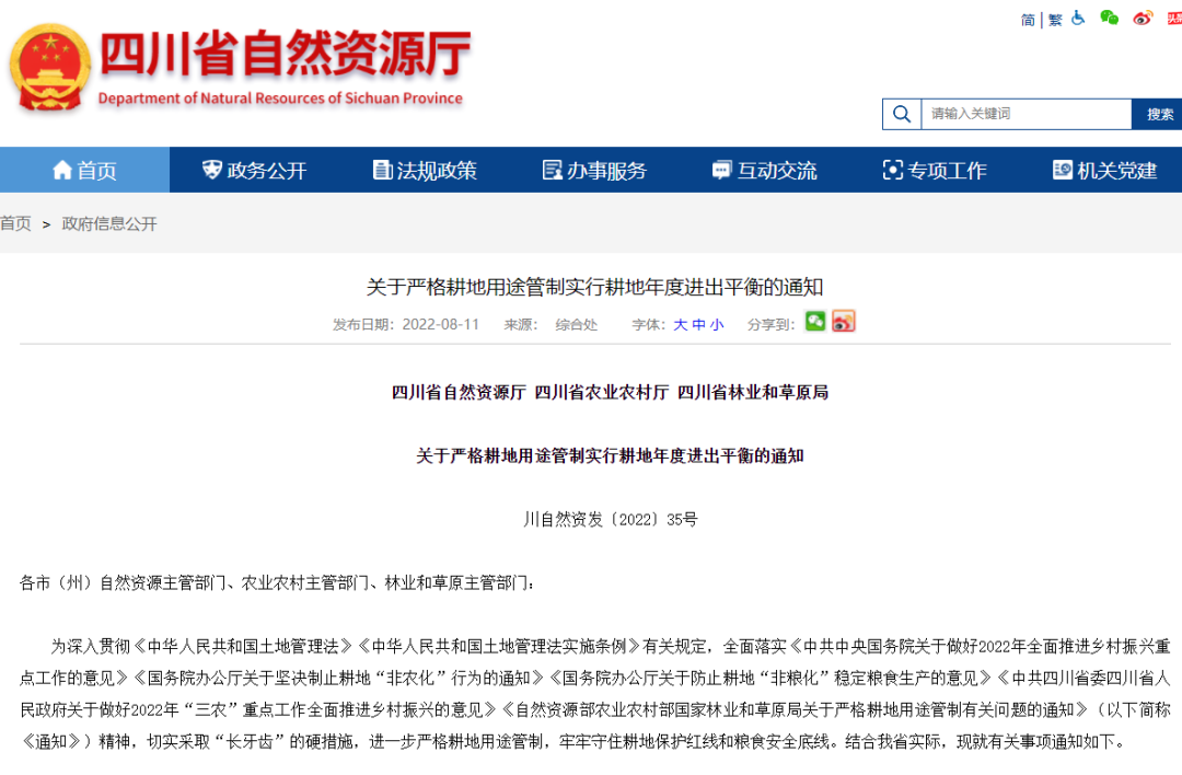 同时,对永久基本农田的占用和补划进行严格规定,明确非农业建设不得“未批先建”,经依法批准占用永久基本农田的,要按照数量不减、质量不降、布局优化的原则,在可以长期稳定利用的耕地上落实永久基本农田补划任务。《通知》规定➤按照“以进定出”“先进后出”“进大于出”的原则落实耕地“进出平衡”任务,确保补足同等数量、质量的可以长期稳定利用的耕地。明确➤耕地年度“进出平衡”总体方案编报和审批流程为需求方申报,乡镇人民政府提出申请,县级人民政府组织编制,市级人民政府组织审批,自然资源厅、农业农村厅、省林草局备案。同时,结合四川实际,允许每年可编报两次“进出平衡”方案。《通知》明确➤各地要根据年度国土变更调查结果,结合生态保护和农民意愿等情况,对各类可恢复为耕地的地类开展调查评价,建立耕地恢复后备资源数据库。严格耕地恢复实施和验收认定,县级人民政府组织年度耕地“进出平衡”总体方案实施,并依据项目实施主体、实施方式不同,分级分层设置验收权限和部门。明确“进出平衡”地类变化情况最终认定以年度国土变更调查结果为准。同时,充分考虑到四川各市(州)地区差异,提高恢复耕地积极性,确保全省实现年度耕地“进出平衡”,自然资源厅将建立耕地恢复指标储备库,对县域内年度确实无法落实“进出平衡”任务的,可在市域内统筹落实;市域内无法落实的,可通过易地流转耕地恢复指标在省域内落实。明确➤将在平原地区原地类为耕地上种植果树、植树造林的地块,逐步退出,恢复耕地属性。其中,“二调”不是耕地的,新增耕地可用于占补平衡。“二调”时为耕地,后续依法批准转为建设用地的,复垦为耕地后可用于占补平衡。明确➤要严格落实“先补后占”“占优补优”,强调对补充耕地项目实行立项、实施、验收、管护等全程监管,主动公开项目信息,接受社会和群众监督。《通知》明确➤将违法违规占用耕地、耕地年度“进出平衡”与占补平衡指标挂钩,对违法违规占用耕地从事非农业建设或耕地年度“进出平衡”未落实的,将直接冻结所在地相应的补充耕地指标,在规定期限完成整改的可解除冻结,否则直接扣除相应的补充耕地指标。坚决遏制新增违法违规占用耕地行为,对国家“非农化”“非粮化”文件出台后,未经批准改变永久基本农田耕地地类的,应稳妥处置并整改恢复为耕地;未经批准改变一般耕地地类的,原则上整改恢复为耕地,确实难以恢复的,统一纳入2022年耕地“进出平衡”总体方案一并落实。强调➤对违法违规占用耕地行为,要依法依规严肃查处,涉嫌犯罪的,及时移送司法机关追究刑事责任。对实质性违法建设行为,要从重严处。《通知》明确➤各级党委、政府要切实担负起耕地保护主体责任,严格落实耕地用途管制,强化耕地年度“进出平衡”统筹安排和日常监管,确保完成耕地保有量和永久基本农田保护目标任务。各地要统筹整合项目和资金,鼓励农村集体经济组织、农民和新型农业经营主体等参与耕地恢复。强调在耕地恢复过程中,要充分尊重农民意愿,合理把握节奏,稳妥有序推进。明确➤将定期开展耕地动态监测监管,每年末利用年度国土变更调查结果对各市(州)耕地“进出平衡”落实情况进行检查,检查结果纳入市级政府耕地保护责任目标考核和耕地保护党政同责考评内容。四川省自然资源厅将牵头抓好《通知》的落地实施工作,指导各地全面加强耕地用途管制,有序编制实施2022年度耕地“进出平衡”方案,确保可以长期稳定利用的耕地不再减少,为打造新时代更高水平的“天府粮仓”助力。
