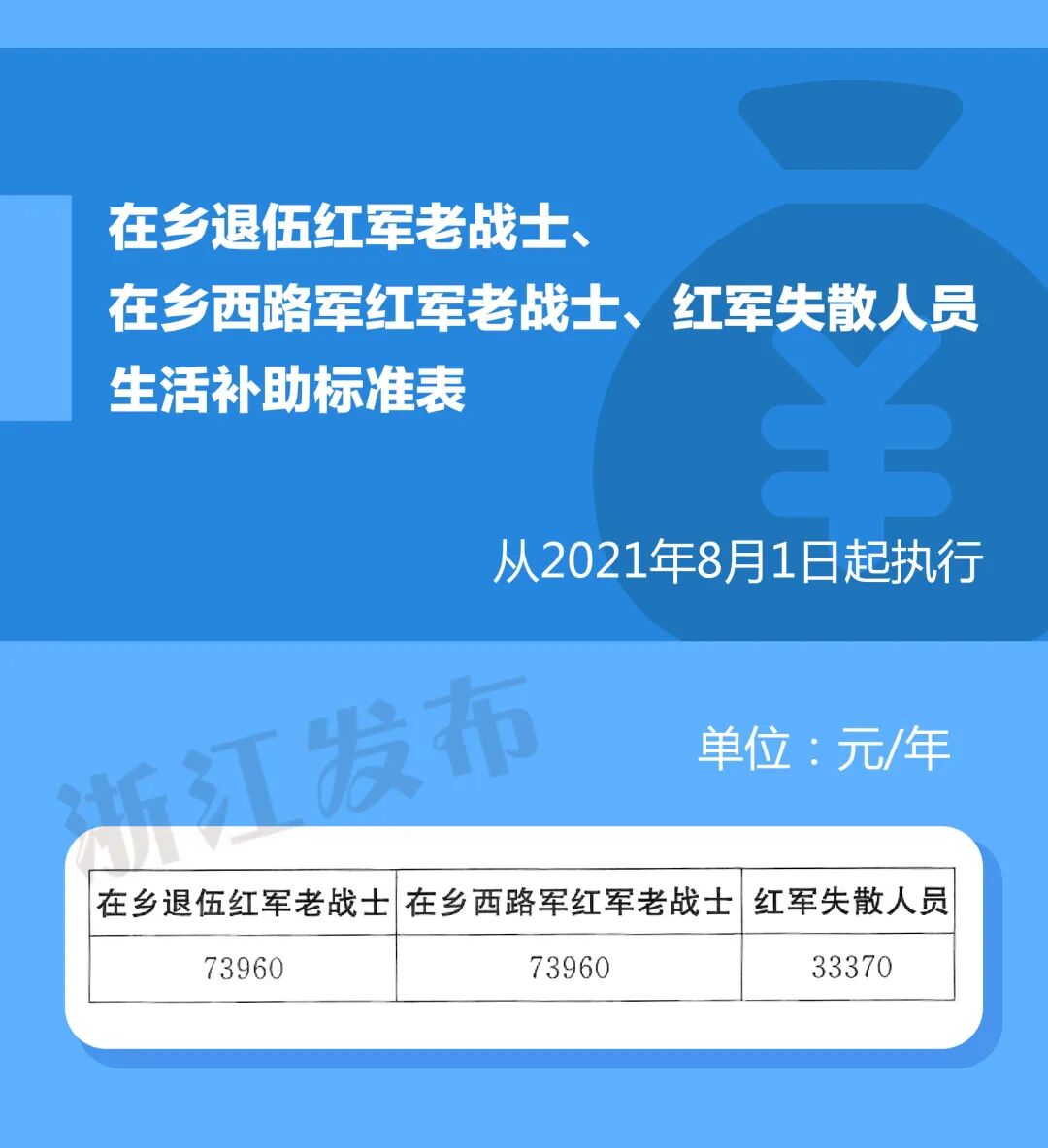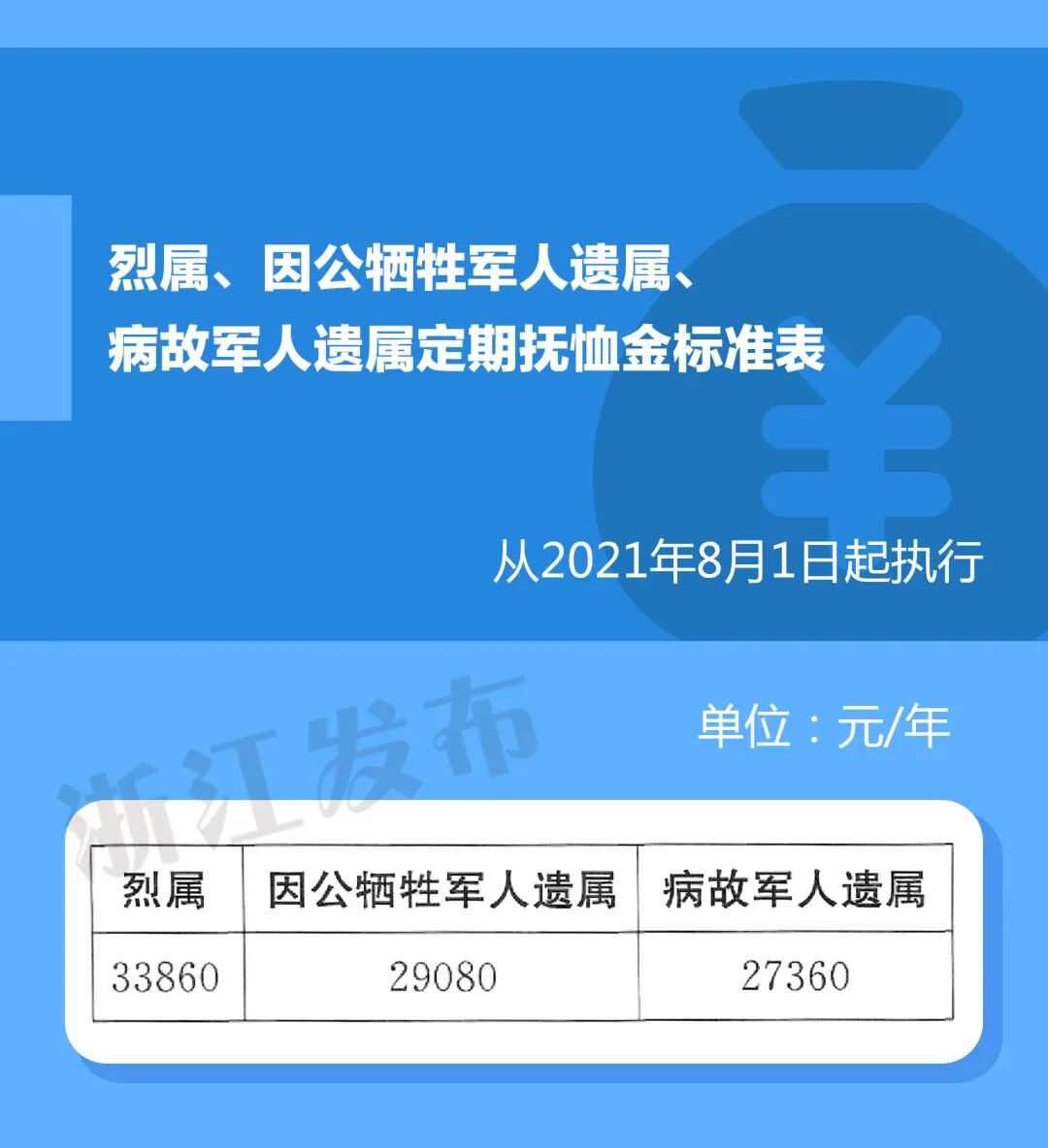 为确保各类优抚对象抚恤和生活补助政策落实到位,结合《浙江省军人抚恤优待办法》和浙江省抚恤补助标准自然增长机制等政策规定,浙江从2021年8月1日起调整部分优抚对象等人员抚恤和生活补助标准。