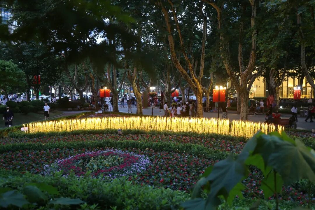 中国红与金色麦穗结合,红色花卉地被象征鲜红国旗,金色麦穗点缀其间,在夜间还可以点亮,颇有星星之火可以燎原之感。