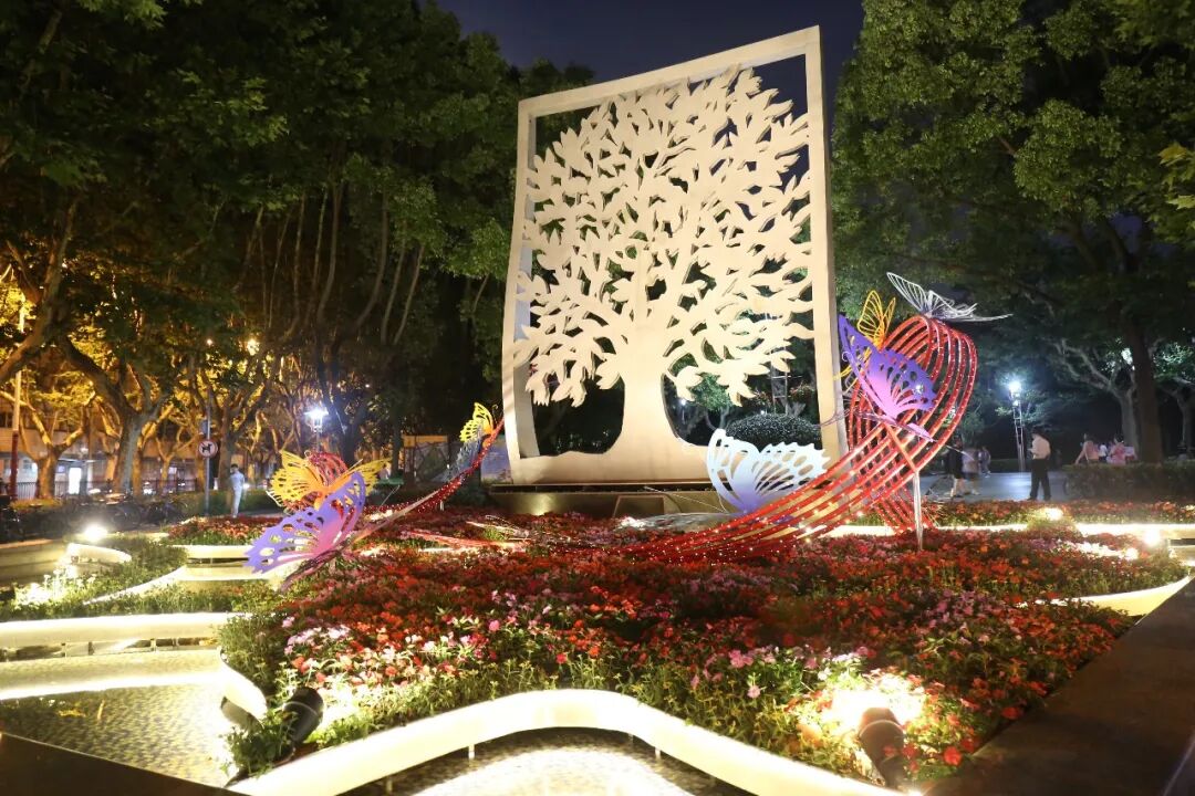 徐家汇公园百代小楼前的悬铃木大道浓密苍翠充满法式情调,留声机造型花坛雕塑流淌而下五色花瀑,岁月留声中让人缅怀革命年代的峥嵘岁月。