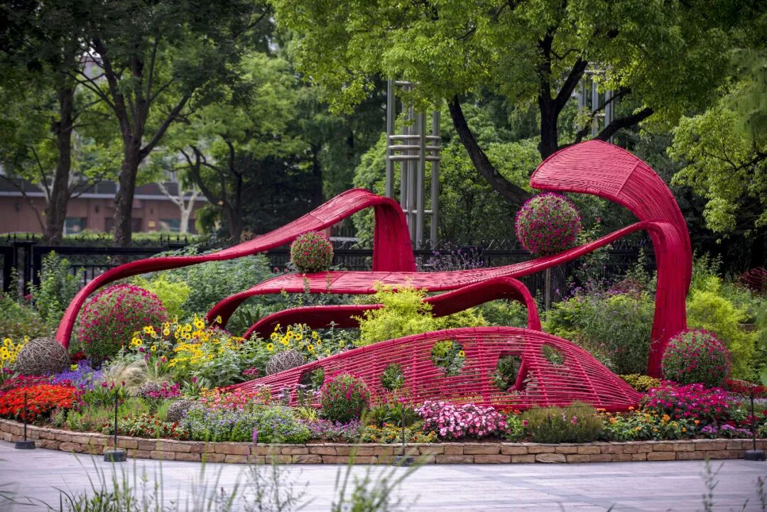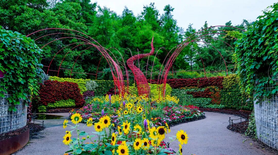 向日葵、金光菊等花卉的明亮黄与竹编构架的鲜艳红相碰撞,以艳丽的色彩献礼建党百年。