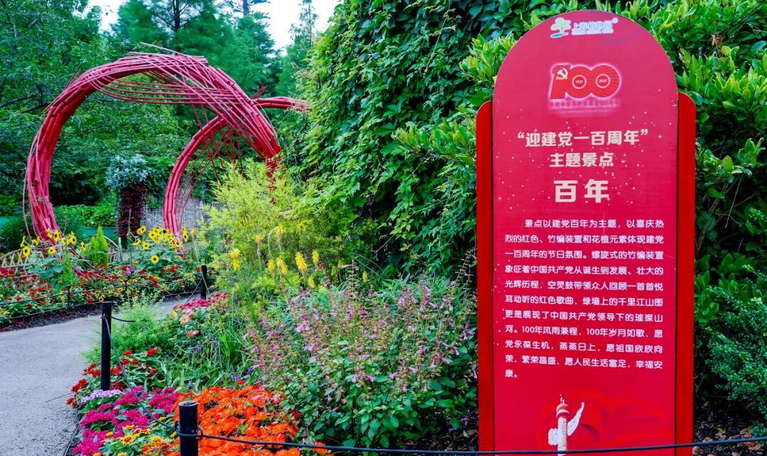 景点“百年”位于二号门绿化示范区瑶华桥东侧展示区,以建党百年为主题,以喜庆热烈的红色、竹编装置和花植元素体现建党一百周年的节日氛围。螺旋式的竹编装置象征着中国共产党从诞生到发展、壮大的光辉历程,空灵鼓带领众人回顾一首首悦耳动听的红色歌曲,绿墙上的千里江山图更是展现了中国共产党领导下的璀璨山河。