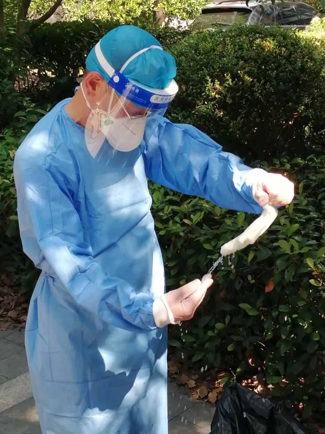 昨日一早发布的高温橙色预警,对于正在进行核酸检测采样的工作人员来说,是一场巨大的考验。早上六点多,华臻居委会的工作人员和志愿者们开始准备东区的“极限挑战”,口罩、手套、防护面屏、防护服……