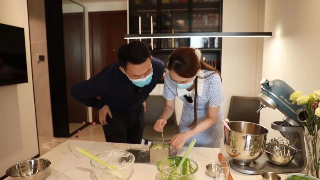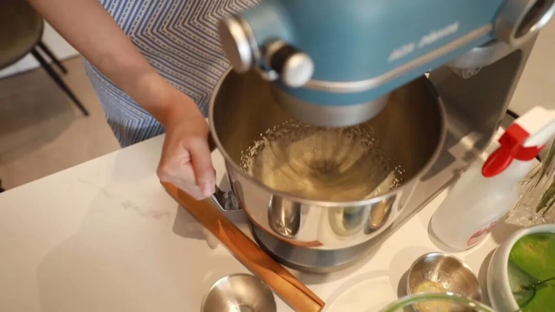 在这道简单的甜品中,抹茶原本的味道容易凸显出来,菠萝特别选择了品质更好的抹茶。她总结,抹茶酸奶大理石慕斯蛋糕的关键点在打发后的淡奶油、牛奶和吉利丁混合液、酸奶等混合步骤。“奶油不能跟太高温的东西混合在一起,遇到高温打发的奶油会消泡,体积变小,口感也会变差。”
