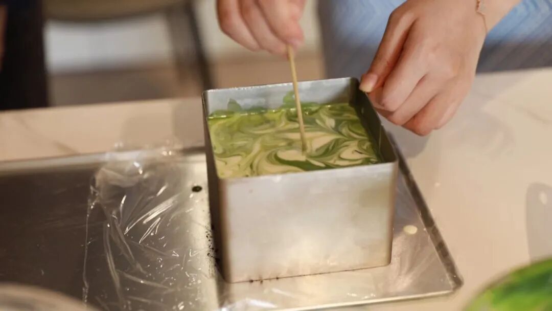 4.将抹茶和原味慕斯糊交替倒入模具中,用牙签划出纹路,放入冰箱冷冻2小时,或冷藏固形后享用。