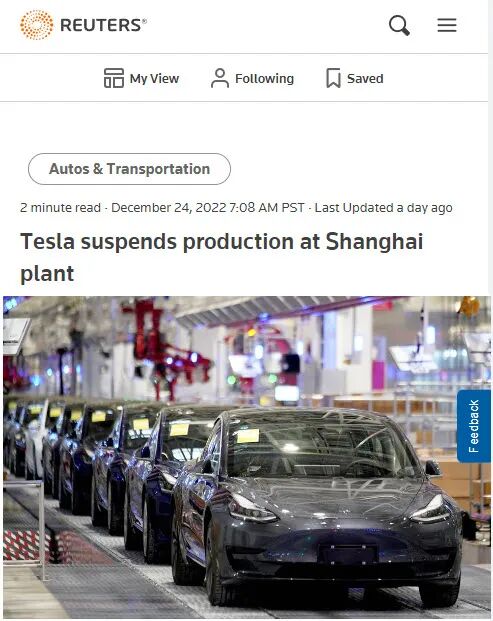 路透社报道,根据一份内部通知和两名知情人士的说法,特斯拉上周六暂停了上海工厂的生产,从而提前了此前在12月最后一周暂停该工厂大部分工作的计划。