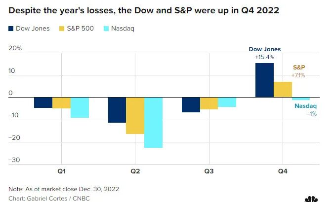 尽管全年下跌,但道指和标普500指数在去年最后三个月确实打破了连续三个季度下跌的局面。然而,由苹果(Apple)、特斯拉(Tesla) 和 微软(Microsoft)等公司主导的纳斯达克指数,自2001年以来首次连续第四个季度出现负增长。然而,12月份的这三个平均值都是负值。