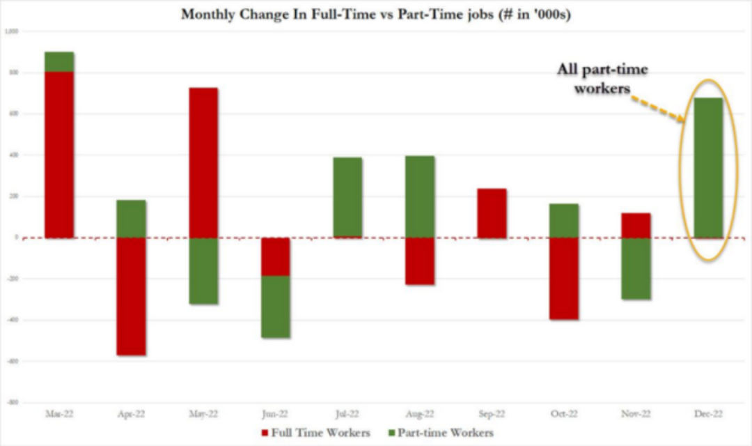 12月份,全美全职工人13229.9万人,环比减少1000人;与此同时,兼职工人数量激增67.9万人,从2611.5万人增加到2679.4万人。最后,雪上加霜的是,身兼数职的工人的数量激增了37万人。这意味着,如果按照实际获得新工作的人来进行计算,12月的非农新增就业应该是负数。