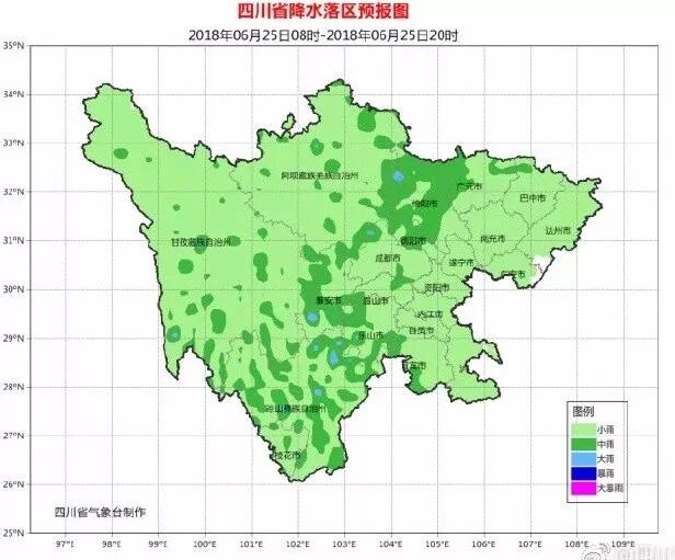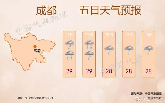 据@四川气象 最新天气预报,未来24小时:盆地各市阴天间多云有阵雨或雷雨,盆地西部大部地方有中到大雨,其中广元、绵阳、德阳、成都、雅安、眉山6市的部分地方有暴雨,局部大暴雨;川西高原及攀西地区阴天间多云有阵雨或雷雨,雨量小到中雨,局部地方有大雨....