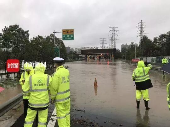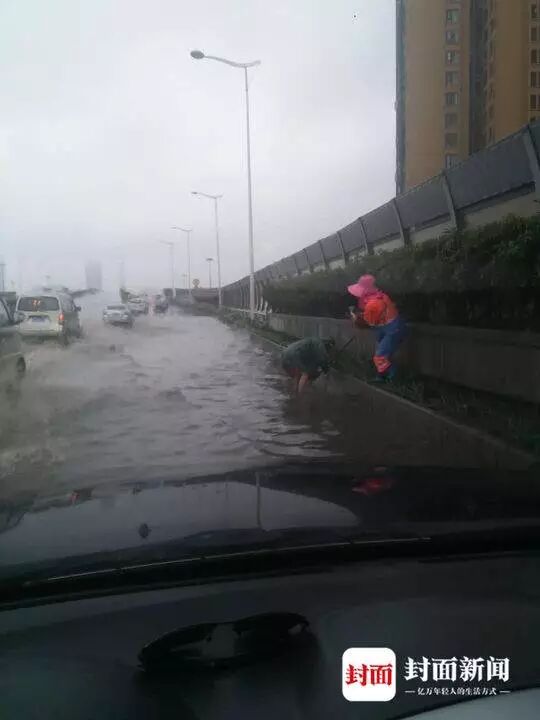 15:38,金丰高架进城段,因下水管道较小,暴雨量太大无法及时排水。城市管理系统的市政和环卫工人,合力抢通。