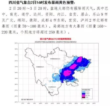 2日16时,四川暴雨蓝色预警升级为黄色预警。今天晚上到明天白天:盆地各市阴天有雷雨或阵雨,雷雨时有短时阵性大风,雨量普遍达中到大雨,其中广元、绵阳、德阳、成都、眉山5市东部和乐山、巴中、达州、南充、遂宁、资阳、内江、自贡8市及宜宾、泸州2市北部的部分地方有暴雨,局部有大暴雨,个别地方有特大暴雨;