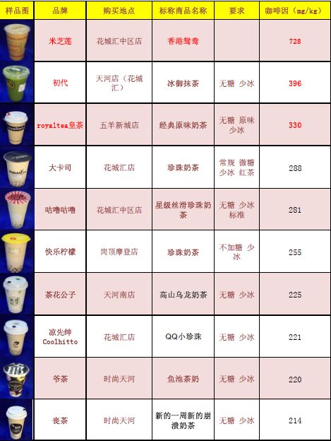 检测结果显示,全部样品均检出咖啡因,含量范围为125-728mg/kg,最高的是米芝莲的香港鸳鸯奶茶,高达728mg/kg。