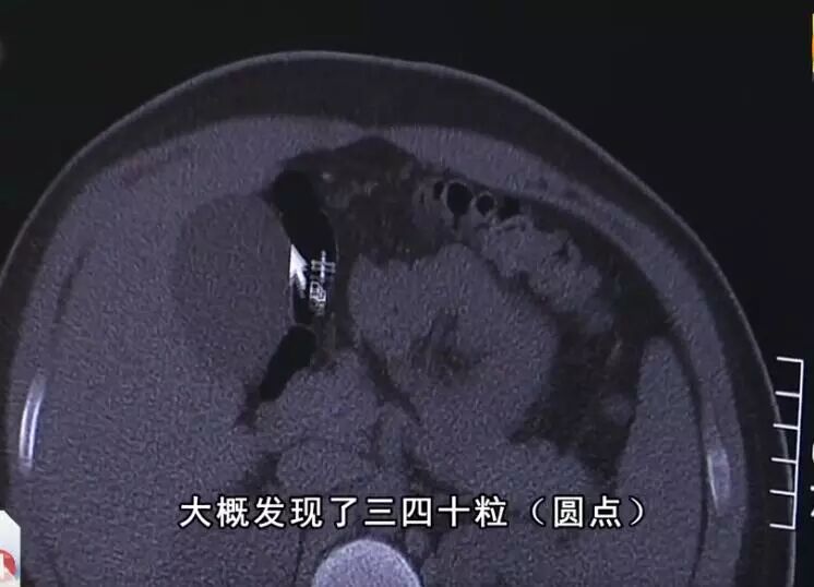 医生立即给这个男孩儿做了腹部CT检查,CT片子让医生吃了一惊,从片子上可以看到,从医院的腹部CT的片子我们可以看到,男孩的胃里面有很多白色圆点。