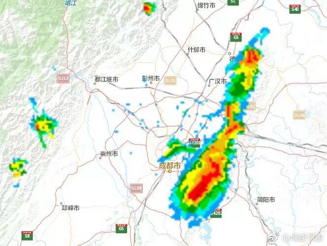 成都气象12时40分发布短时天气预报:目前我市龙泉驿、青白江、简阳、天府新区、金堂和主城区已有对流发展并将持续;预计未来6小时我市大部分地区有雷阵雨天气,个别地方雨量达暴雨,降雨时伴有短时阵性大风,个别点有冰雹,请注意防范。