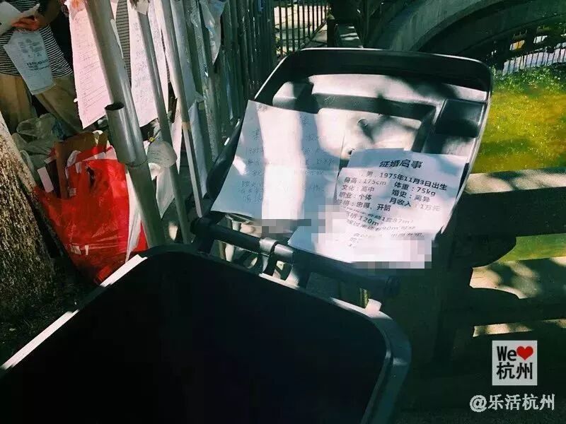 栏杆、遮阳伞、树干上,甚至是垃圾桶的盖子上,都贴满了“征婚”“相亲”“寻缘”的各种打印或手写纸。